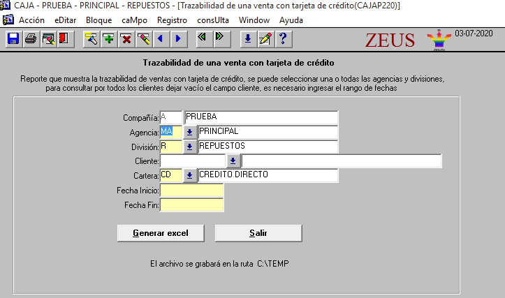 En la ruta C:/TEMP se creará el archivo de excel, el reporte en excel contiene los siguientes campos: