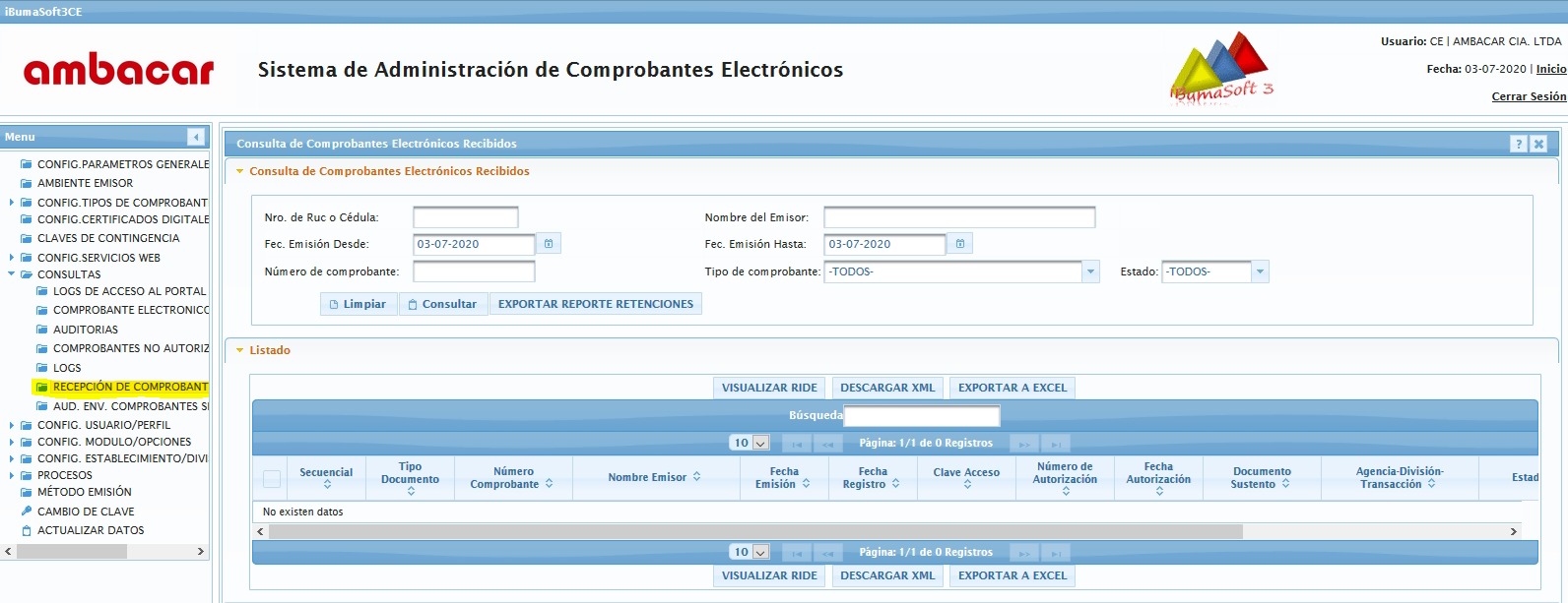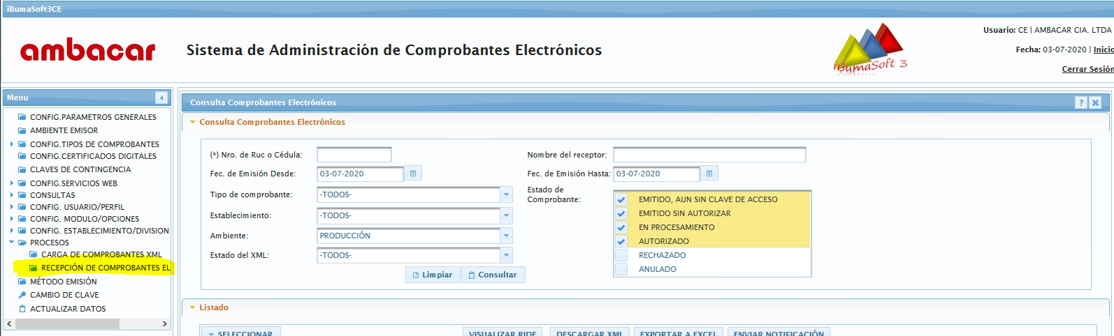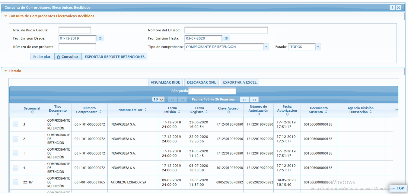 Esta pantalla permite consultar los comprobantes electrónicos que se cargaron en la recepción, permite consultar mediante la fecha de emisión del documento cargado, o número de comprobante, una vez seleccionado los filtros de búsqueda se debe dar clic al botón consultar.