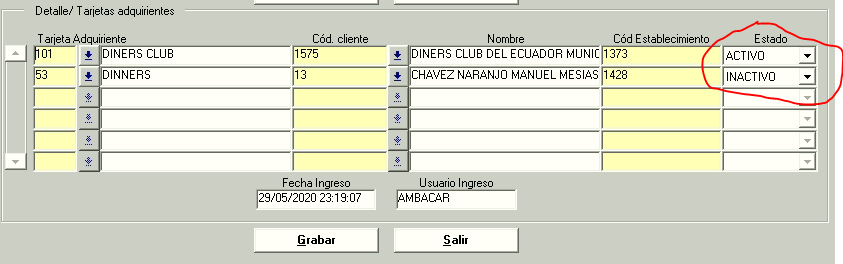 En la parte inferior “Detalle/ Tarjetas adquirientes” se podrá crear la configuración de tarjetas adquirientes que pertenezcan a la tarjeta emisora se puede crear varios registros, se debe ingresar el código de tarjeta adquiriente, código de cliente, código establecimiento.