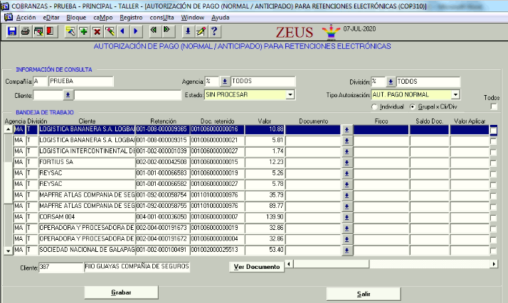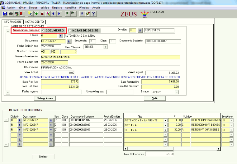 En los casos de retenciones manuales se creará un proceso de autorización de pago de clientes, de acuerdo a las condiciones solicitadas en el requerimiento, donde una vez seleccionado el documento, se calcularan los valores de retención de acuerdo a la matriz de porcentajes que se encuentre configurada.