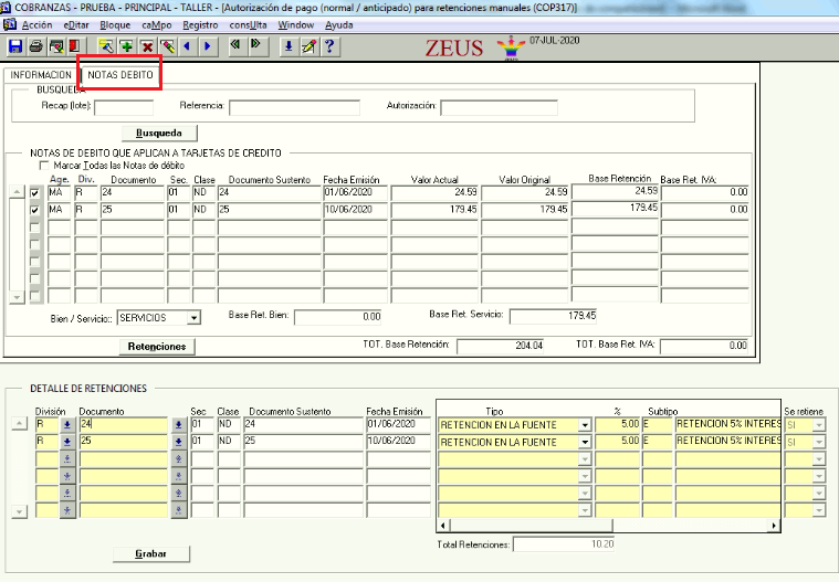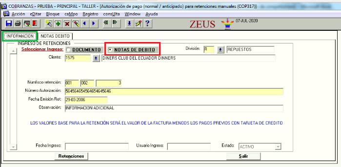 En los Pagos Anticipados (PA), cuando se ingresen las formas de pago de retenciones, solicitará el número de documento relacionado a la retención, documento que en Cuentas por Cobrar ya debe encontrarse con saldo cero para permitir realizar el anticipo, y sin ingresos que contengan retenciones. Sin embargo en caso de ser ese documento relacionado una nota de débito por pago con tarjeta, no podrá ingresarse como forma de pago la retención.