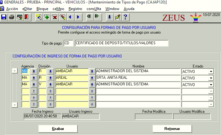Al ingresar correctamente a la nueva pantalla “Configuración para formas de pago por usuario”, se muestra lo siguiente, en la configuración se podrá seleccionar los usuarios que tendrán el acceso a la forma de pago, se debe seleccionar la agencia, división y el usuario.