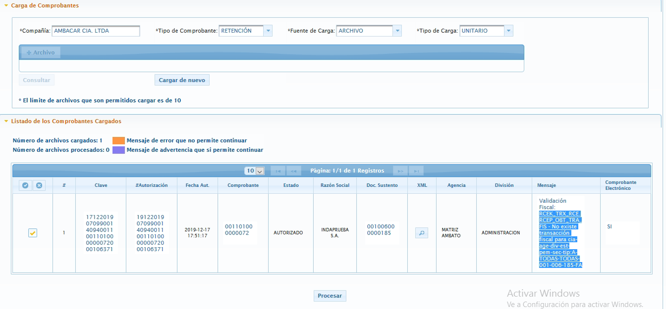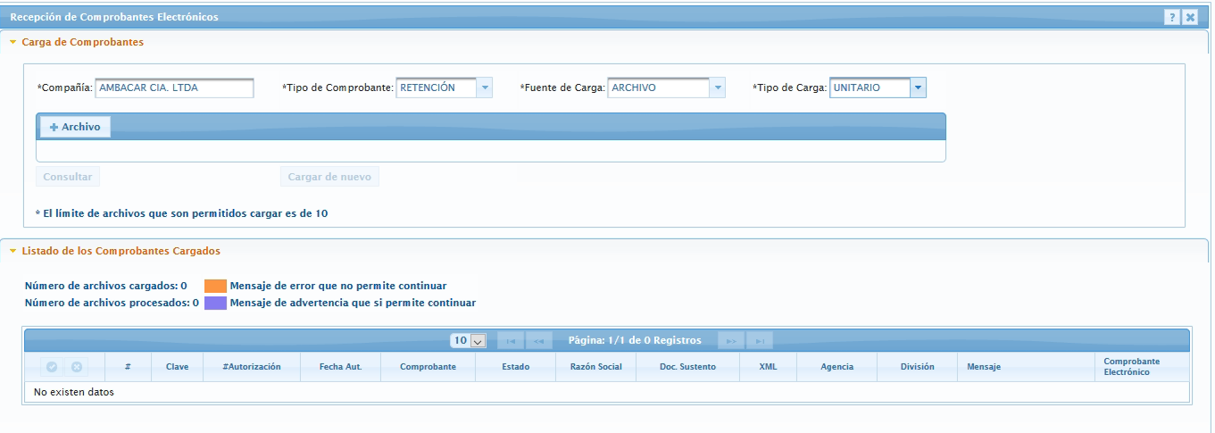 Luego se debe presionar el botón consultar para visualizar los comprobantes cargados, existe un campo “Mensaje” en el que se mostrará los errores, también en la parte superior del detalle se visualizan unos mensajes que indican el número de archivos cargados y procesados