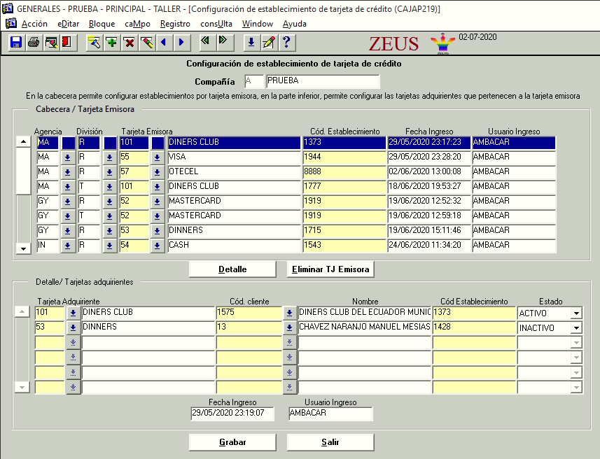 Esta pantalla permite configurar establecimientos por tarjeta emisora, en la parte inferior, permite configurar las tarjetas adquirientes que pertenecen a la tarjeta emisora.