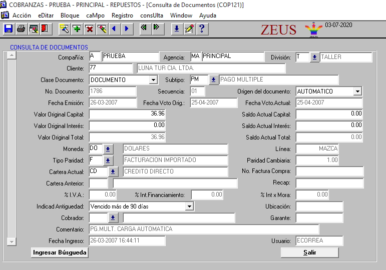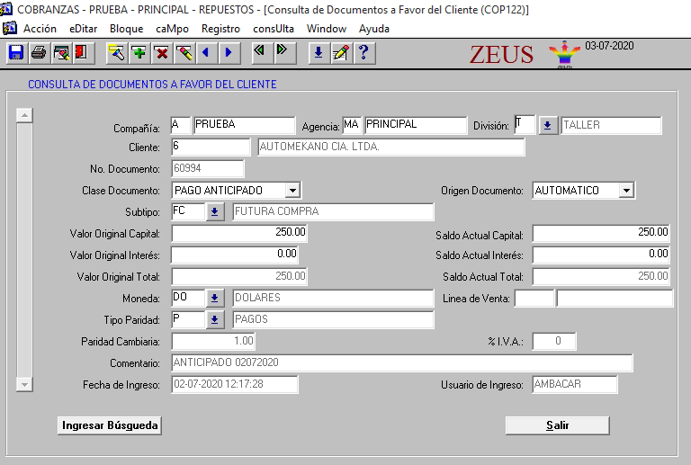 En el caso de un documento de pago anticipado al momento de presionar el botón Detalle Doc. Se mostrará la pantalla de “Consulta de documentos a favor del cliente”.
