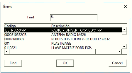 En el campo Código se debe seleccionar de la lista de ayuda, el ítem que se desee configurar.