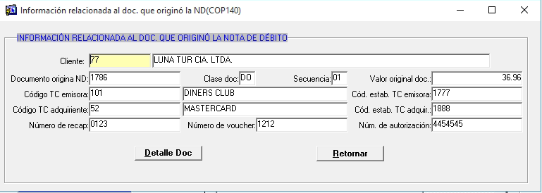 En esta pantalla se podrá visualizar la información del documento que originó la nota de débito, se visualizan los siguientes campos: