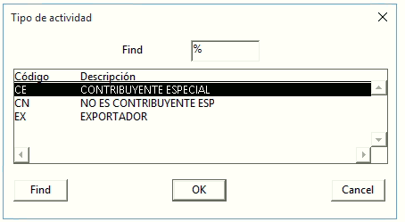 (Los datos adicionales están en la tabla CIATT138 CO_COD_TIPO)Al presionar el botón ubicado alado derecho del campo “Contribuyente especial? Exportador?” se mostrará una lista de ayuda donde se podrá seleccionar el correspondiente tipo.
