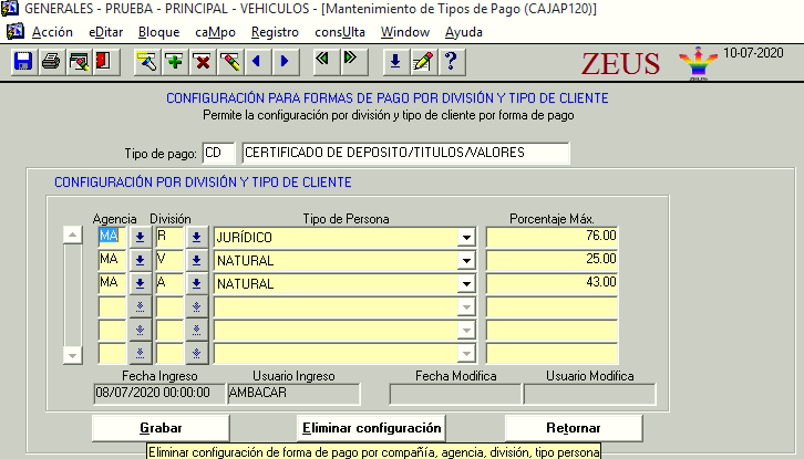 Al ingresar correctamente a la nueva pantalla “Configuración para formas de pago por división y tipo de cliente”, se muestra lo siguiente, en la configuración, se debe seleccionar la agencia, división, tipo de persona y el porcentaje máximo.