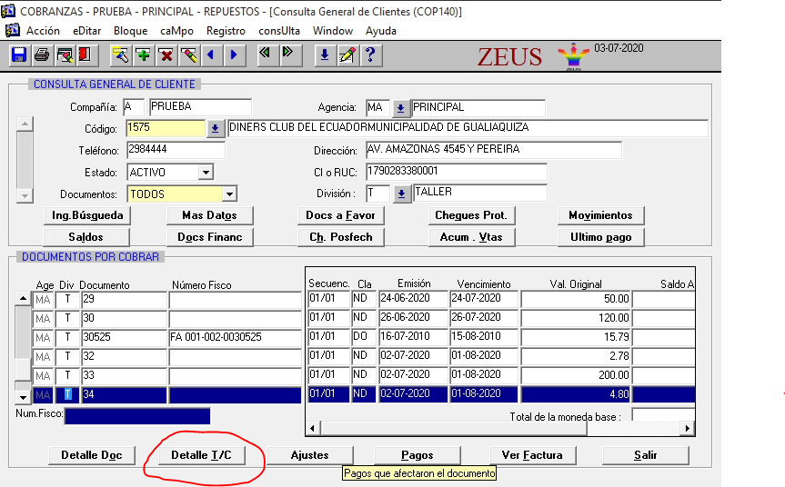 En la pantalla de consulta general de cliente se agregó un botón “Detalle T/C” ubicado en la parte inferior de la pantalla.