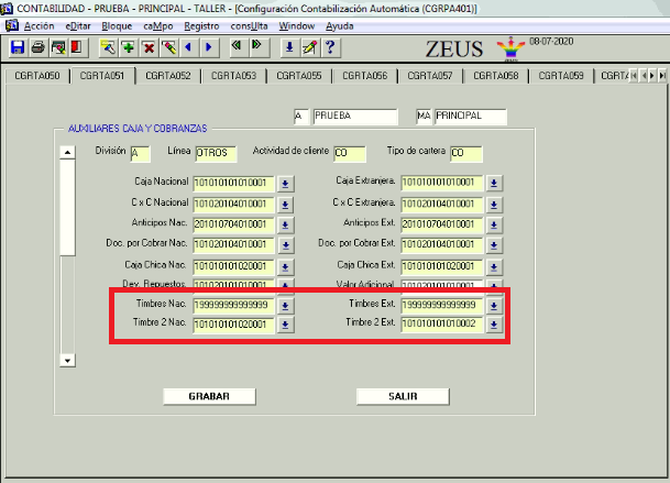 Se debe configurar en la pestaña CGRTA051 las cuentas de Timbre