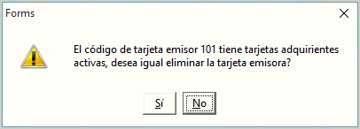 Al presionar el botón se elimina la configuraciónde tarjeta emisora y su detalle(tarjetas adquirientes), pero si la tarjeta emisora tiene registros(tarjetas adquirientes) con estado “Activo” entonces se mostrará una alerta para confirmar si desea continuar con la eliminación.