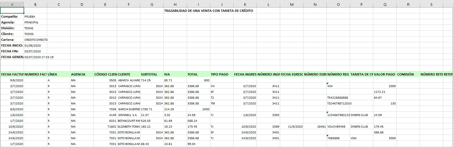 Esta pantalla permite consultar información relacionada a ventas en las que se han realizado con tarjeta de crédito, se podrá consultar mediante los siguientes filtros de busqueda, agencia, división, cliente, cartera, fecha inicio y fin.