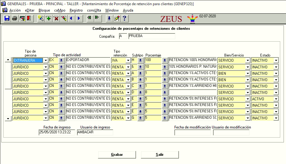 TABLA genet135 Esta pantalla permite la configuración de porcentajes de retenciones de clientes, se debe seleccionar el tipo de persona, tipo de actividad, tipo de retención (IVA, RENTA), Subtipo, porcentaje, al seleccionar el porcentaje automáticamente se cargará si es bien o servicio (campo no modificable).