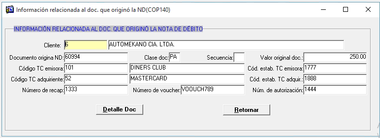 Al presionar el botón mientras está ubicado en un registro de ND cuyo origen es por el pago con tarjeta de crédito entonces se visualizará la siguiente ventana: